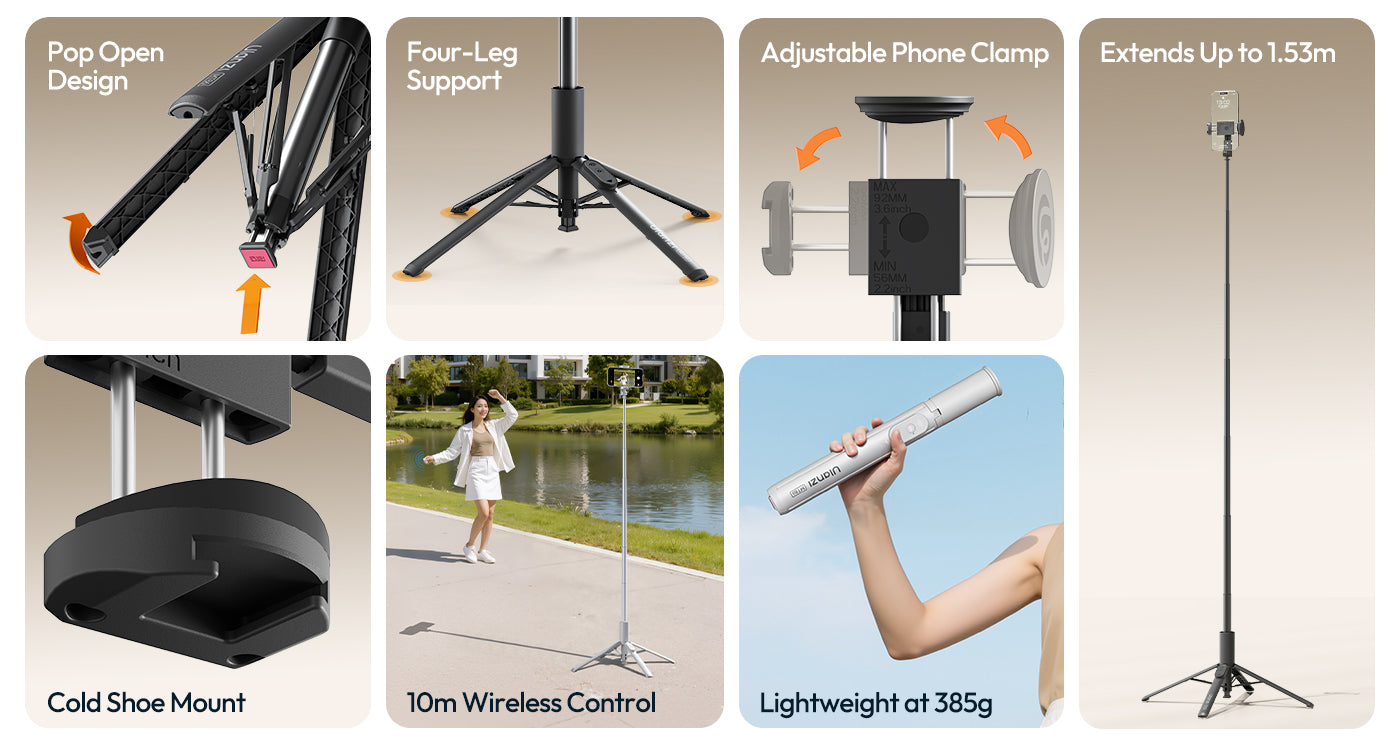 Boasting an upgraded four-leg design with non-slip pads, this tripod stays steady and secure—its 8-section extension is perfect for full-body shots. At just 380g (lighter than a bottle of water), it’s ideal for on-the-go use.